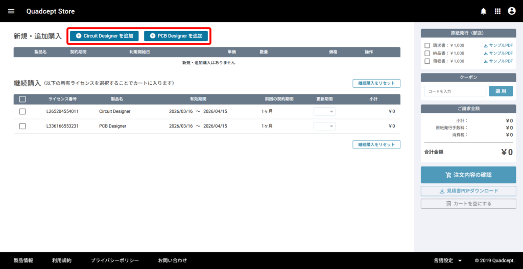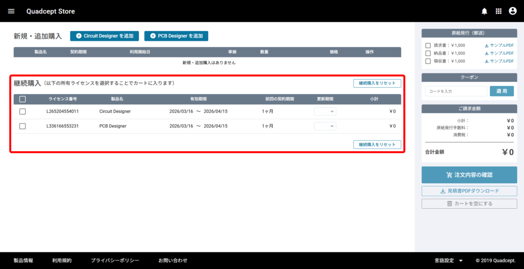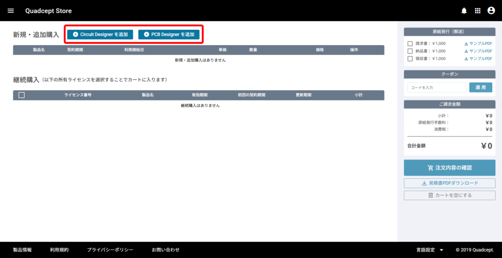 ライセンスの「新規購入」「追加購入」「継続購入」は、Quadcept Store から操作できます。