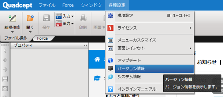 Quadceptを起動後に上のメニューバーの【各種設定】→【バージョン情報】をクリックします。